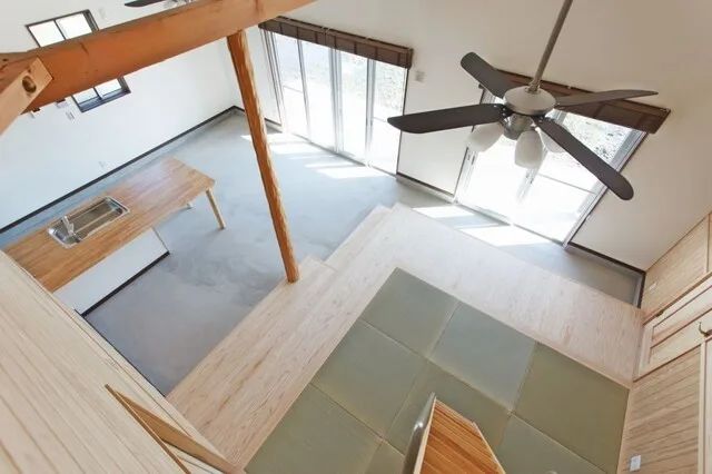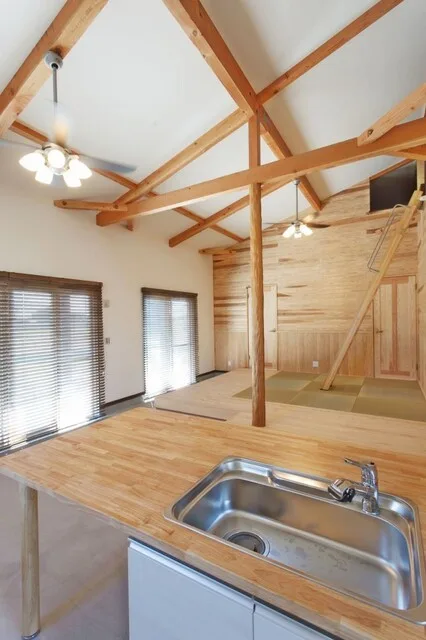 キッチンからは市松模様に配置した畳とロフトへの入り口のはしごが見えます。