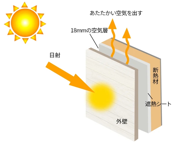 夏の熱い空気は遮熱シートで遮られ、その熱は18mmの空気層を通って上のほうへ放出されます。だから家の中に入ってこないのです。