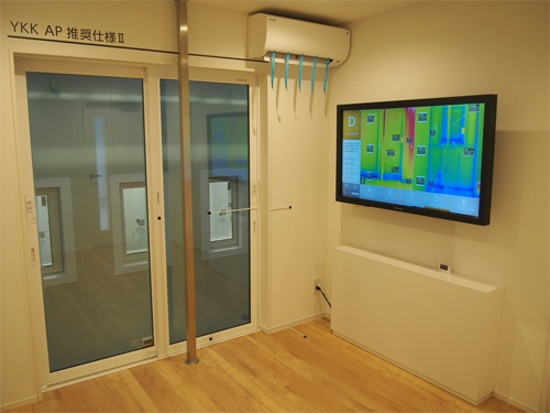 特に「断熱効果」については、冬の外気温を想定した巨大な冷凍庫の中に、20年以上前の一般的な断熱仕様(壁・床・窓)の部屋(窓は単板ガラス入りアルミサッシ)から、最新の高断熱仕様の部屋(窓は高性能トリプルガラス樹脂窓「APW430Kr」)まで5つの断熱仕様の部屋を設けて、全身で比較体感することができます。