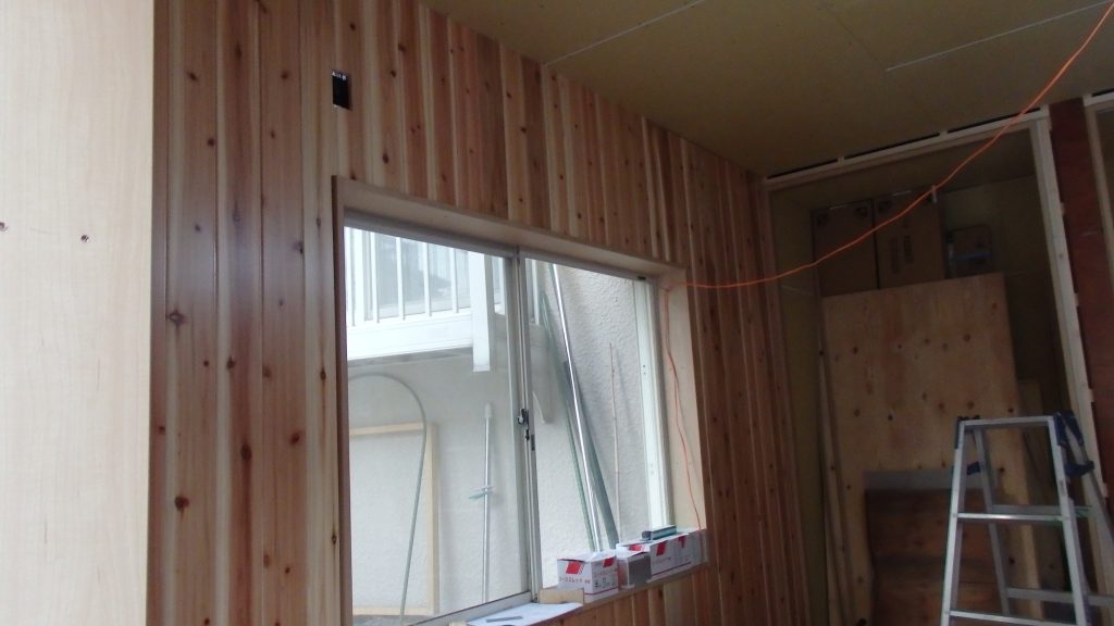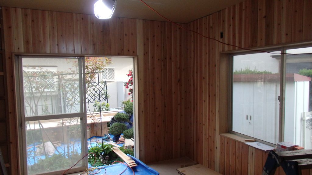 和室から洋室に変更する中で、壁面に何と杉板を貼っています!