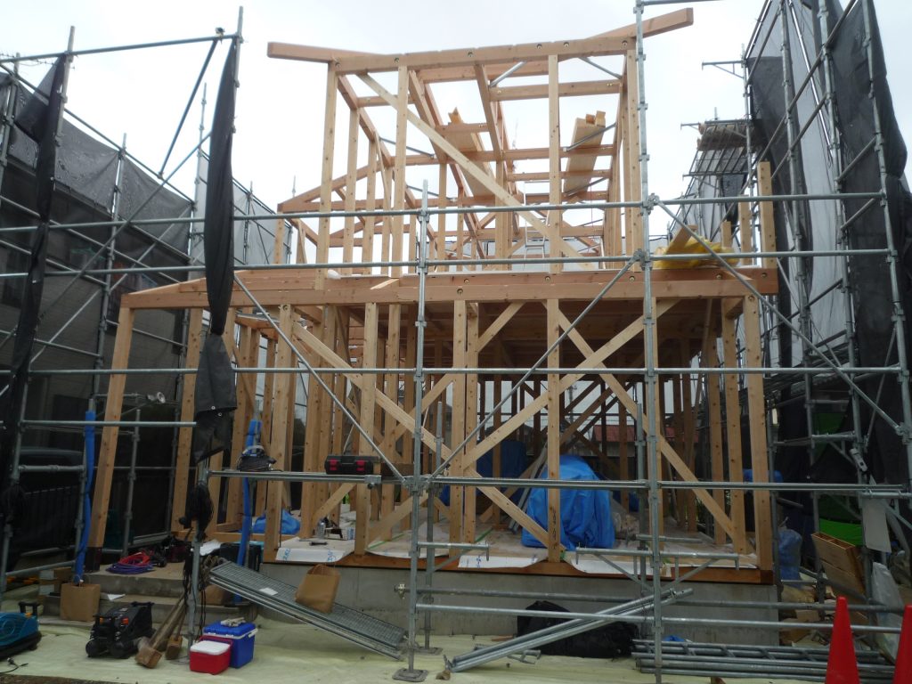 先日、雨も降らずに事故も無く無事に上棟致しました!!