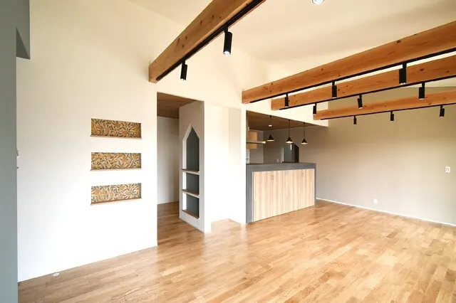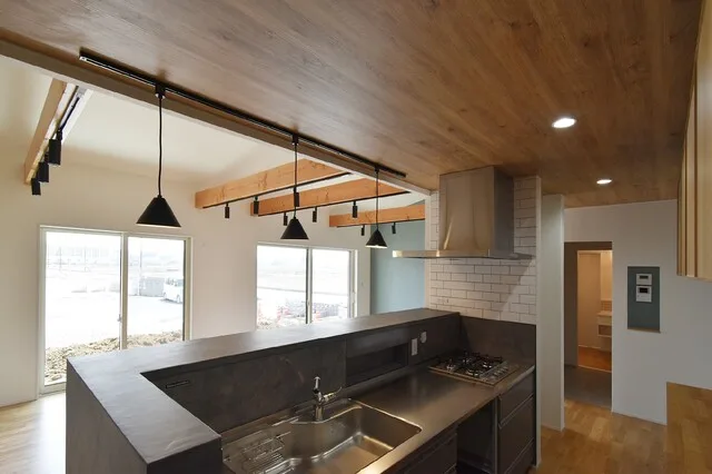 天井に注目してみてください。キッチンの天井は低く、リビング側は 梁を現(あらわ)しにして天井を高くしてあるのが分かりますでしょうか。このつくりによって、より開放感を感じられる空間になっています。