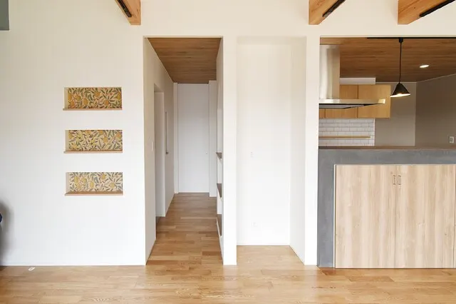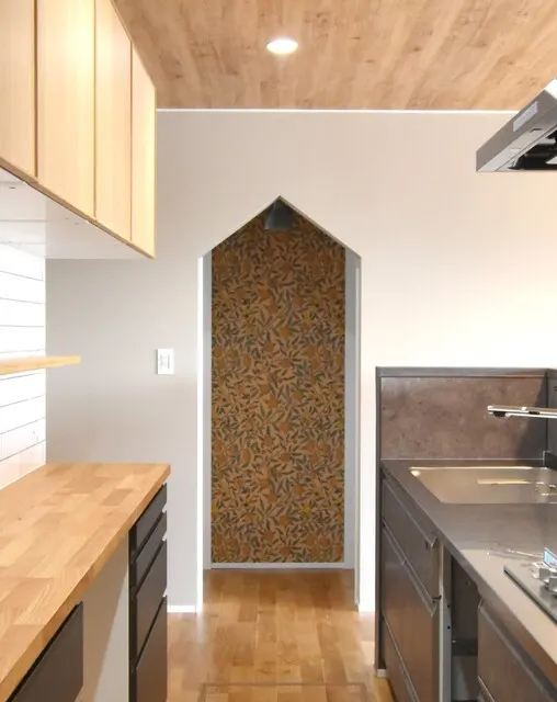 居室へつながるちょっとした壁にもお施主様のこだわりが。中央の壁紙はお施主様がご自身で見つけてこられた輸入クロスです。細部まで丁寧に家づくりをされています。
