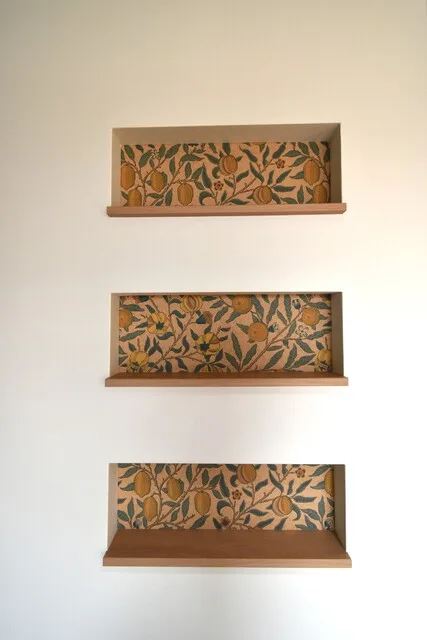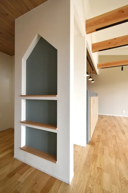 造作の棚はお施主様のセンスが生かされ、輸入クロスや三角になっているデザインなど、とてもオシャレな空間を演出しています。