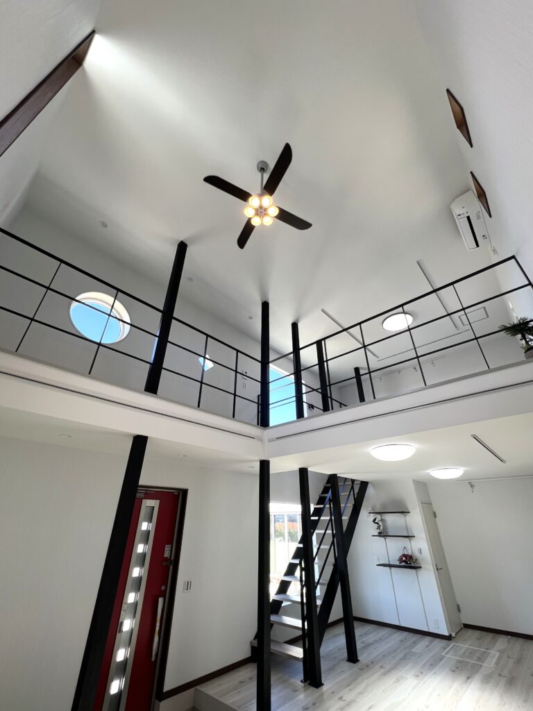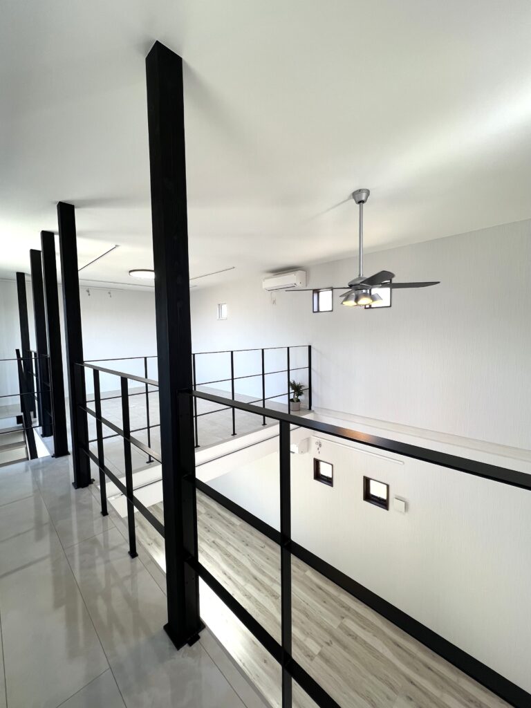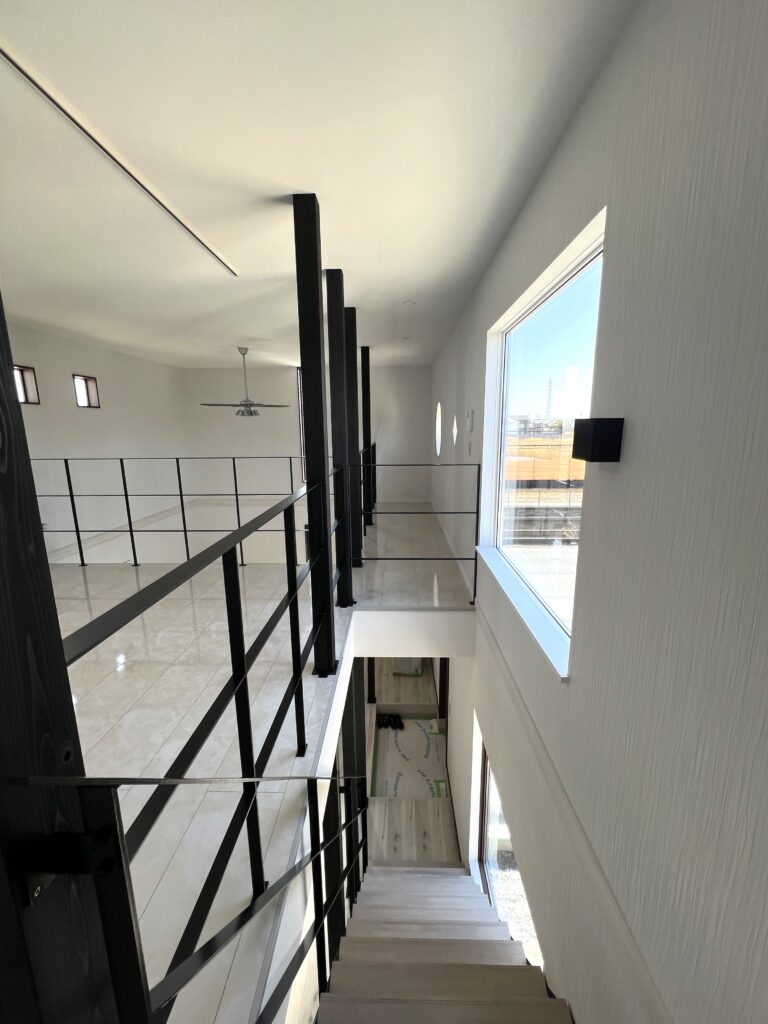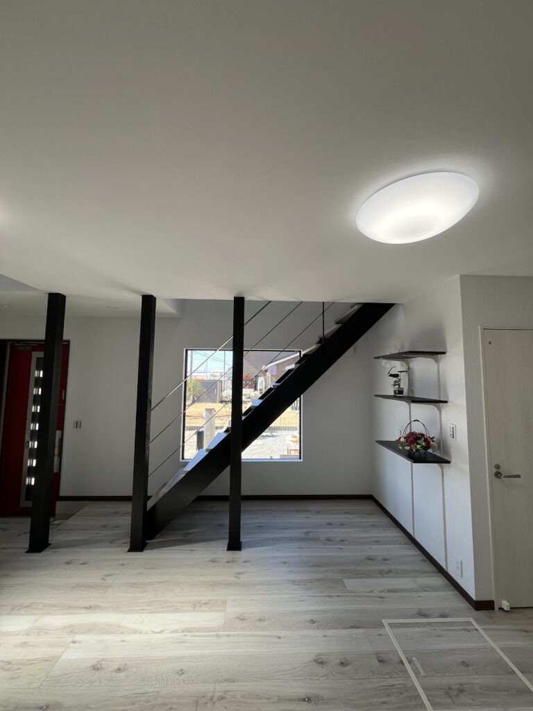 白を基調としたシンプルな空間の中に、シャープな鉄骨階段を配置。ブラックのラインが空間全体を引き締め、美しいコントラストを生み出しています。