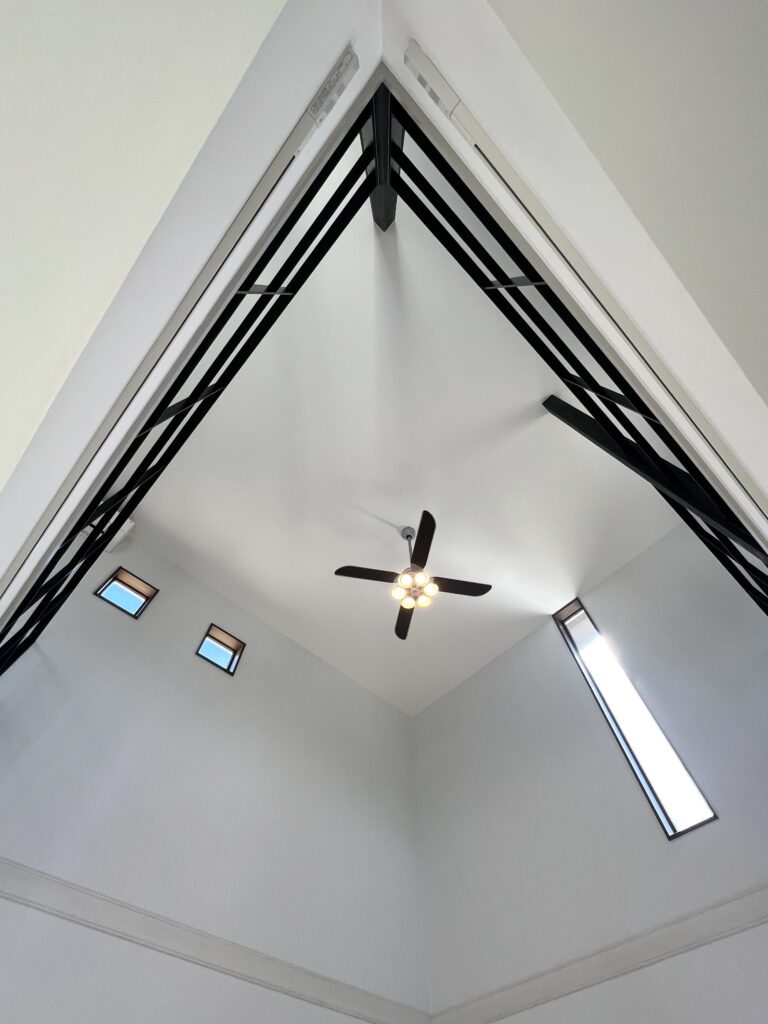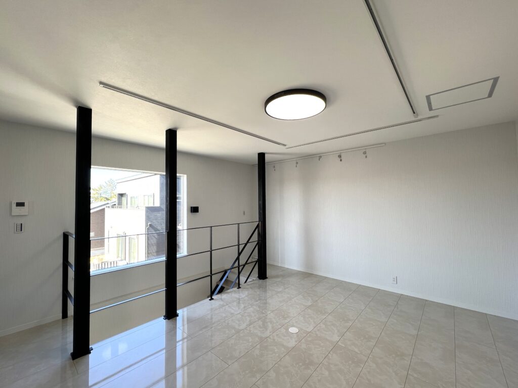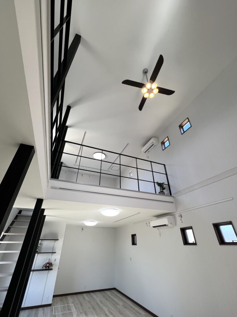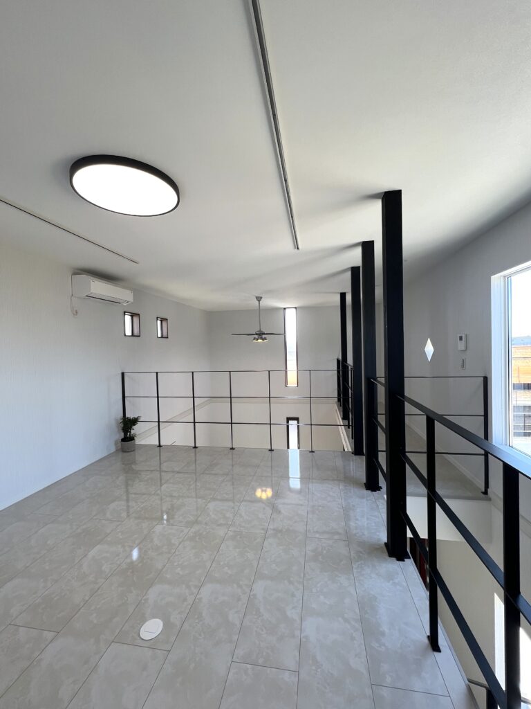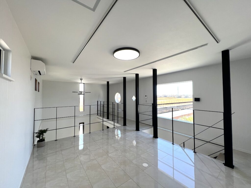 白を基調としたシンプルな空間の中に、シャープな鉄骨階段を配置。ブラックのラインが空間全体を引き締め、美しいコントラストを生み出しています。